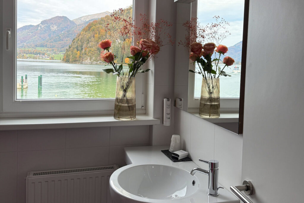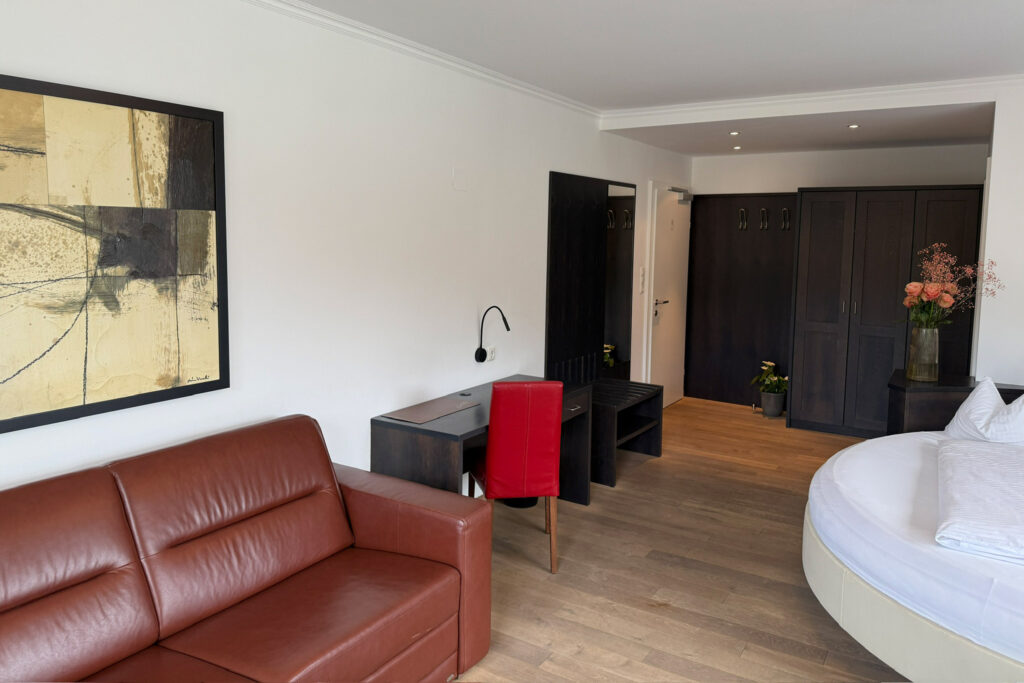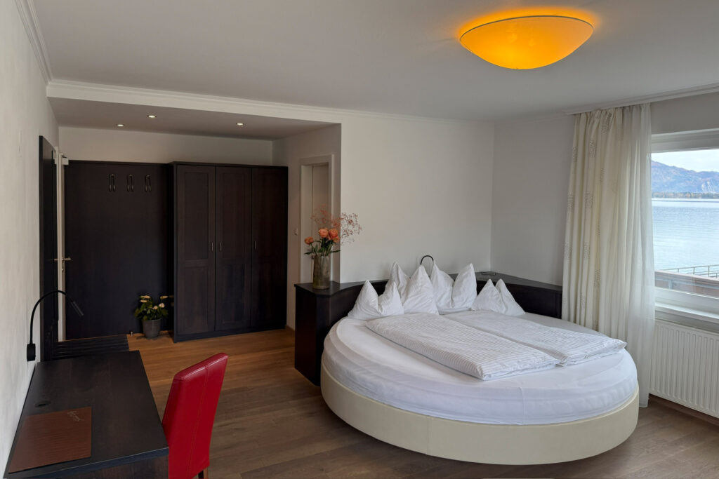 Unsere Junior Suite begeistert durch das runde Superior Doppelbett, eine Ausziehcouch aus Leder sowie das großzügige Badezimmer. Das Highlight ist der Balkon mit direktem Blick auf den Wolfgangsee und die umliegende Bergwelt!